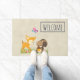 Welkom deurmat met een leuke illustratie met een baby hert en een kleine eekhoorn met een eikel en een vlinder die boven hun hoofd vliegen. Deze schattige boswezens staan op wat gras met wat grillige paddenstoelen aan hun voeten. Zandbruine achtergrond.