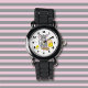 Een schattig horloge voor kind dat de tijd leert lezen met een grijze cartoon muis die een stuk kaas eet. Kies de kleur van de armband die u wilt hebben en voeg indien nodig een omlijsting toe. © ArianeC Illustraties-Alle rechten voorbehouden