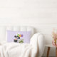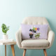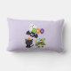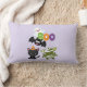 Een kussen met een zwarte vliegende knuppel, een groene mannetjesvleermuis met witte bandjes en een schattige zwarte kat met een oranje heksenpet. Boo schreef in leuke kleurrijke letters met een vrolijk spook dat achteraan zweeft. Lichte paarse achtergrond.