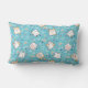 Een kussen met een schattig kattenpatroon, geplaatst op een blauwe achtergrond en versierd met regenbogen en pootafdrukken en meer.