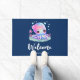 Welkom doormatten met een afbeelding van een schattige, jonge octopus met een bloem op haar hoofd. Grote heldere ogen en een vriendelijk gezicht.