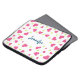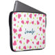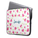 Een gepersonaliseerde laptophoes met een schattig patroon, bestaande uit roze en groene trommelende harten op een witte achtergrond.