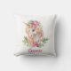 Schattig, korrelig eenhoorn met roze bloemen op de decoratorkussen van witte kinderen. Gepersonaliseerd met een naam in een schattig manuscriptdoopvont.