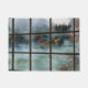 Een koud najaar landschap bekeken door een bevroren raam vroeg op een ochtend. Fir- en dennenbomen met ijs dat hun naalden wit maakt, monsters in tinten rood, oranje en geel, vorst-witgebakken gras dat door de mist wordt gezien en dat uit een verborgen stroom komt. Het flenderen van het raam aan beide zijden zijn rode en groene rozen bladeren.