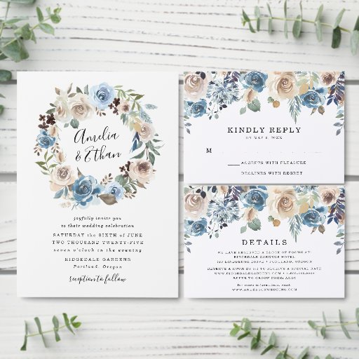 Cartes d'insertion de mariage élégantes et stylées avec une bordure supérieure de fleurs et de verdure aquarelles blanches, beige et bleues. Personnalisez la carte en ajoutant des informations importantes telles que les hébergements d'hôtel, le site web du mariage, les directions, etc.
