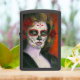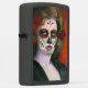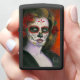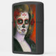 Een respectvolle aansteker voor Día de Muertos. Het toont een portret van een vrouw met gehakte ogen met een traditionele make-up van de suikerschedel. Haar gezicht is versierd met traditionele rozen en gouden accenten.