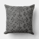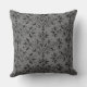 Een vierkant gooiend kussen met een elegant damppatroon van mazen en bladeren met zwarte rollen op donkergrijs.