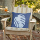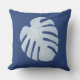 Tropische bladkussen in donkerblauw. De voorkant heeft één groot blad, met gepatterde bladeren op de achterkant. De bladeren zijn lichtblauw op een donkerblauwe achtergrond, maar u kunt de achtergrond in om het even welke kleur veranderen u houdt van.