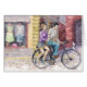 Une fille et un jeune homme à vélo devant les fenêtres des magasins. Aquarelle sur papier. Artiste Zolotareva