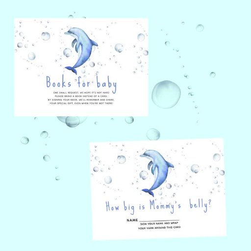 Un petit dauphin en route avec cette invitation de baby shower sur le thème de la mer, avec des bébés dauphins dans des aquarelles bleu doux. Bulles d'eau d'aquarelle.