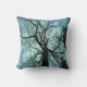 Dit werpen kussen kenmerkt het uitzicht van de bodem van een zeer hoge knol boom die omhoog naar de bovenkant kijkt. De blauwe schemerhemel creëer een interessant, abstract patroon van gedempt zwarte boomstam en takken. Deze grote oude boom leeft in Robert H. Treman State Park in Ithaca, New York. Het afbeelding wordt op de achterkant herhaald.