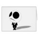 Grote ogen en dragen een zwart-wit pak met boeg stropdas. Witte achtergrond.