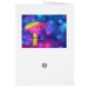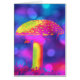 Neonkleurige psychedelische paddenstoel in roze en geel tegen een helder blauwe en paarse achtergrond van mousserende bokken