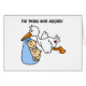 Schattige T-shirts met een dubbel ontwerp, mokken, canvas tassen, knoppen en andere tweelingartikelen met een stork met een blauwe deken met twee glimlachende babyjongens en tekst met de tekst "De tweeling is aangekomen!".