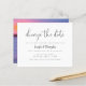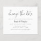 Yikes! Onvoorziene omstandigheden gebeuren, en als ze dat doen, kun je je gasten gemakkelijk op een leuke en gemakkelijke manier laten weten dat je je trouwdatum moet uitstellen met dit minimalistische briefkaart van uitstel van de zwarte en witte bruiloft. Met "verander de datum" in een tekenfilmlettertype en eenvoudige serif typografie. Als onderdeel van de begrotingsselectie hier op Zazzle, komen deze uitnodigingen niet met enveloppen en passen ze ook niet goed in een standaard envelop. De dichtstbijzijnde grootte is A6, maar er zal een gat van ongeveer een halve inch zijn. Als u het gebrek aan snugheid niet erg vindt, kunt u zulke breed beschikbare A6-enveloppen gebruiken. Anders, kan dit ontwerp naar een standaard 5x7 formaat (dat met enveloppen komt) worden overgebracht gebruikend het hulpmiddel van de ontwerpoverdracht. Als ruwe gids, vanaf het ogenblik van het schrijven, zouden 100 begrotingsuitnodigingen (met inbegrip van een volumekorting) rond $39 kosten terwijl 100 standaard 5x7 uitnodigingen met inbegrip van enveloppen ongeveer $135 zouden kosten. Uw kilometerstand kan variëren afhankelijk van de promotiecodes van Zazzle, de verkoop ter plaatse of prijswijzigingen.