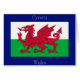 De vlag van Wales op een donkerblauwe achtergrond. Wales, gedrukt in het Engels en het Welch.