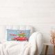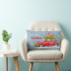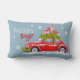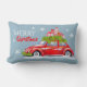 Decoratief kussen voor vrolijk kerstfeest, met een schattige illustratie van een feestelijk versierde auto met dennentakken en dozen met cadeaus op het dak.