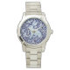 Een van mijn cobaltblauw met copyrightrechten en witte "Dedham Blue"-borden van konijnenontwerpen wordt op dit unieke horloge hergeïnterpreteerd. Kobaltblauw en wit combineren in een boslandmontage met vogels en andere wezens. Fantastisch, uniek kunstwerk en design van Tuzi Williams.