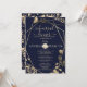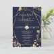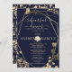 Moderne geometrisch en realisme, in kleuren van middernacht blauw, en champagne. Rozen, volledige bloem, lange stamknoppen en bladen die met geometrische lijst- en goudvlokken in elkaar kruisen. De verfijnde verfijning brengt een beetje naast een overvloed aan romance voor een geweldig repetitief diner.