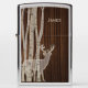 Een handige aansteker van de Zippo-merk in de openlucht, met een afbeelding van een donkergekleurd houtkorrel, op de voor- en semi-transparante berkenbomen en één enkel hert. Pas het licht aan met tekst voor jezelf of als een geweldig cadeauidee voor je favoriete jager in de openlucht man.