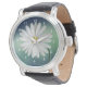 Een serene foto van één delicaat met madeliefje. Zachte, fijne witte bladen met een helder geel midden. De achtergrond is een mistachtig groenblauw kleur.