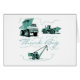 Een vuilniswagen, voorste lader en kraan zijn voorzien van onze Think Big Building Design T-shirts, bodysuit's, mokken, magneten, knoppen, kaarten, stickers en andere apparaten en geschenken voor bouwvoertuigen.