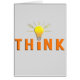 Een eenvoudig ontwerp dat "Denk na" zegt met een gloeilamp die de letter "I" in geel en oranje gestippeld. Er zijn golvende lijnen rond de bol die het ongekende haar van Albert Einstein zouden kunnen vertegenwoordigen.