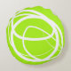 Ce coussin rond moderne présente un design graphique synthétique composé d'un arrière - plan vert citron clair et d'une ligne blanche elliptique d'un côté, tandis qu'un de la même couleur plus épais, d'une forme triangulaire irrégulière, occupe presque tout l'autre côté.