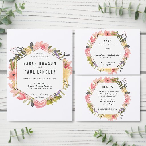 Waterverf bloemen in een zeshoekig lijst. Deze kaarten voor bruiloft zijn volledig aanpasbaar, zodat u uw trouwbenodigdheden kunt aanpassen aan uw specifieke behoeften. Verander de doopvontgrootte, de stijl, en de kleur door op de knoop "aan te passen" te klikken. Wenk de informatie opnieuw op uw persoonlijke stijl. Stuur me voor aangepaste bestellingen een bericht op: sika_273@yahoo.com