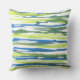 Coussin imprimé avec motif rayé abstrait en bleu, vert et blanc, à partir d'aquarelle originale.