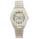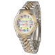 Dit vrouwenhorloge heeft een modern design van uitgestrekte diamanten en sterbursts op een gebied van wit.