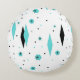 Ce Retro Turquoise Diamonds and Starbursts Round Coussin est une nouvelle façon de s'imprégner d'un style vintage. Il présente des étoiles kitsch, noires sur des pois turquoise, aux formes géométriques, turquoise et diamant noir. Customisez la couleur arrière - plan sur ce produit moderne du milieu du siècle si vous êtes audacieux, ou laissez-le blanc si sobre est plus votre style. Vous êtes sûr de profiter de notre hommage aux années 1950. Achetez ceci aujourd'hui et soyez le chat le plus cool de votre quartier.