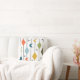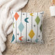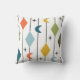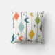 Dit kussen heeft een modern ontwerp uit het midden van de eeuw van verticale lijnen met diamanten en boemerangs, met steruitbarstingen verspreid op de achtergrond.