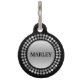 Zilveren ruitvorm. Aan de andere kant zijn de naam en het telefoonnummer op een zwarte achtergrond