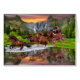 Un coucher du soleil d'or, des cascades de montagne, et des pins verts entourent la diligence de Wells Fargo pendant que son équipe de chevaux la précipitent à travers le lac de miroir faisant une réflexion magnifique pour une image occidentale sauvage.