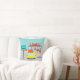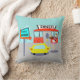 Bedien iets speciaals met het Diner Sierkussen van 1950. Het tekenontwerp van de cartoon is voorzien van een rood baksteengebouw met blauwe vensters, grijze dubbele deuren en een wit bord dat zegt: "Diner" op het dak. Op de parkeerplaats staat een tweede teken op een stok. Het teken heeft een turquoise achtergrond en een opvlammende rode pijl die de weg wijst naar "Don's Diner". Het bord heeft zijn werk gedaan omdat er een felgele auto is met vinnen naast hem geparkeerd. Hoewel we ze niet kunnen zien, moeten de passagiers van de auto hun lippen inslaan. Een schattige, jonge carhop rolt haar weg naar de auto. Haar bruine haar zit in een staart. Ze draagt een kort, roze uniform met zwarte trim en een wit schort. Op een evenwichtige manier draagt de carhop een zwart bakje met een gigantische hamburger en een verfrissende, ouderwetse glazen fles soda. De achtergrond achter het diner is blauwgroen met lichtblauwe wolken en de silhouetten van cedar-bomen. De tegenovergestelde kant van de kussen heeft een leuk, rood baksteenpatroon.