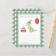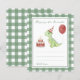 Waterverf kinderen verjaardagsfeestje. Waterverf Dino in verjaardagskaartje, pet met kaarsjes, rode ballon. Groene kooi achtergrond.