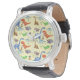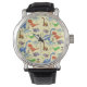 Dino wereld wandklok ontwerp omvat schattige dinosaurussen, vulkanen en palmbomen.