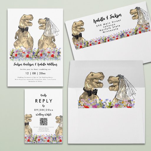 Fun Dinosaur mariage thématique RSVP en ligne QR Code carte de boîtier site Web avec mariée T-Rex et marié dans une prairie fleur sauvage préhistorique colorée. Calligraphie moderne de typographie lunaire avec facile à personnaliser le modèle afin que vous puissiez ajouter le code QR du site mariage et l'adresse web du navigateur et des instructions utiles pour les invités. Unique Tyrannosaurus Rex marié et marié avec aquarelle d'été art floral original oeuvre de l'artiste Catherine Sweetman Idéal pour la réception du jour de mariage ou le dîner de répétition. La suite mariage jumelée comprend tout ce dont vous aurez besoin lors de votre voyage mariage amusant
