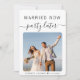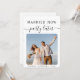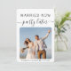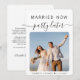 Moderne trouwdag of privé trouwaankondiging. De voorzijde kenmerkt uw foto en "Gehuwd nu, Partij later"in een mengeling van eenvoudige typografie en trendy manuscript. Onder uw foto kunt u uw voornamen en trouwdatum toevoegen. Op de keerzijde kunt u uw aankondiging personaliseren met om het even welke toekomstige festiviteitsplannen en uw namen toevoegen in een handtekening-als manuscript.