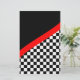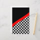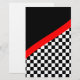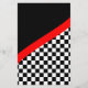 Schrapboekpapier voor mensen die raceboeken maken. Dit unieke krasselpapier voor races is voorzien van een gevarieerd bordpatroon op de onderste helft met een zwarte achtergrond bovenaan en een rode streep die de twee patronen scheidt.