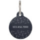 Pet tag with a personalized dog name monogram in a cute script font on the front with your address and phone number in a serif font on the back. The background on both sides is a pattern featuring digitally hand-drawn dog constellations paired with ditsy stars on a black background. Check out our store for more matching items from this collection.