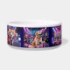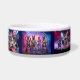 A dog bowl featuring seven dog rock bands. From left to right, they are Shelties, German Shepherds, Chihuahuas, Irish Setters, Samoyeds, Golden Retrievers, and Corgis.