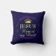 Elegant middernacht blauwe JESUS KONING VAN MIJN HART-Sierkussen, met een gouden gekleurde kroon en faux goudtypografie in het midden, in een diepe paarse kreet. Op de achtergrond staat in de tekst de KONING OF KINGS in een subtiel getild patroon, dat op de rug doorgaat. Dit zou een mooie aanvulling zijn op je kerstdecor, en een prachtig, stijlvol geschenk gedurende het hele jaar.