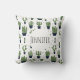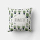 Een gepersonaliseerd kussen met een rustieke westerne smaak. Ontworpen met een bos schattige groene cactussen in een herhalend patroon. Specifiek, groen gekleurde stekelige cactus, in allerlei soorten vormen en maten, elk zittend in zijn eigen donkerblauwe bloempot. Kleine decoratieve driehoekjes ertussen. Grappige illustratie.