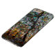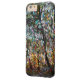 Impressionistisch pointilisme schilderij van een zonsopgang gezien door bomen in een bos.