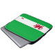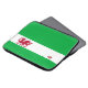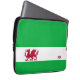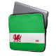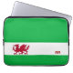 Cette douille d'ordinateur portable en néoprène comporte un arrière - plan de vert avec une bande blanche à travers la partie plus inférieure de la douille, à l'intérieur de la bande blanche est un dragon rouge du Pays de Galles avec sa langue bifurquée, queue bifurquée et griffes pointues. Les couleurs ont employé - le blanc, le vert et le rouge sont identique que le drapeau du Pays de Galles. La conception est imprimée sur l'avant ; le dos est noir.