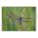 Cette carte de notes présente une jolie libellule bleue tenant sur un axe d'herbe.