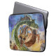Dragons Rising by Traci Van Wagoner Laptop Sleeve is perfect for dragon lovers of all ages. This dragon art features an original painting of an entwining green dragon and gold dragon with a crown in a dramatic sunset sky. The green dragon has a row of houses on his neck and a couple houses are falling. Fantasy art lovers will love this!