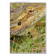 Een close-up van een hoofd van een bebaarde draak die op een gras zit.